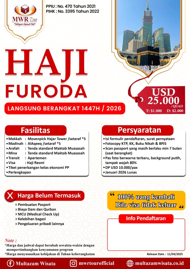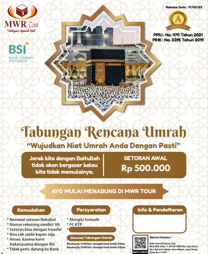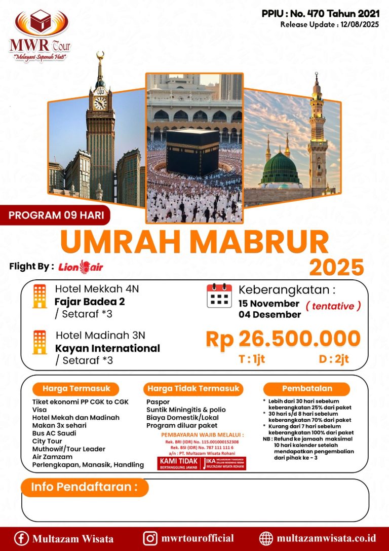 PT Multazam Wisata Rohani dengan brand “MWR TOUR” Berkantor pusat di Ruko Grand Galaxy City,Blok RSK 6 No.11 Kota Bekasi, sudah terbukti berpengalaman lebih dari 13 tahun dan sudah memberangkatkan lebih dari 17.354 jamaah Umroh dan haji Khusus.