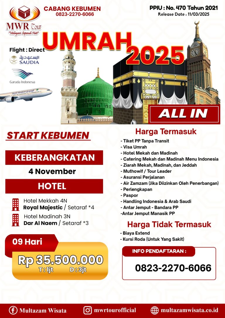 PT Multazam Wisata Rohani dengan brand “MWR TOUR” Berkantor pusat di Ruko Grand Galaxy City,Blok RSK 6 No.11 Kota Bekasi, sudah terbukti berpengalaman lebih dari 13 tahun dan sudah memberangkatkan lebih dari 17.354 jamaah Umroh dan haji Khusus.